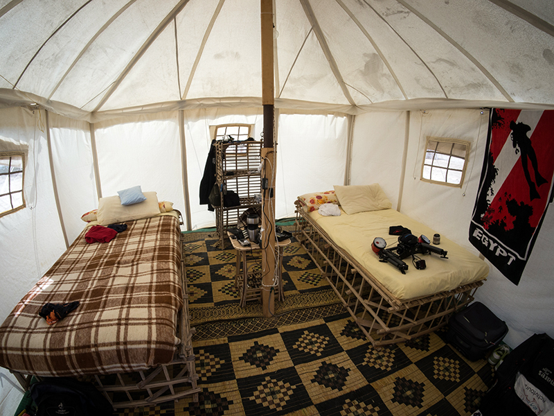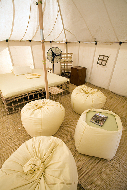 Namiot królewski (24 m2) wyposażony jest w dwa pojedyncze łóżka z pościelą (lub łoże małżeńskie), wentylator, lodówkę, pufy do siedzenia, mały stolik, dostęp do elektryczności (220 V). Damskie i męskie toalety i prysznice (bardzo czyste) znajdują się w głównym budynku campu.